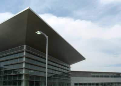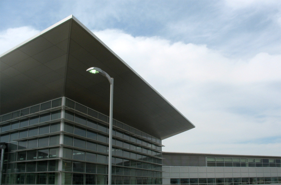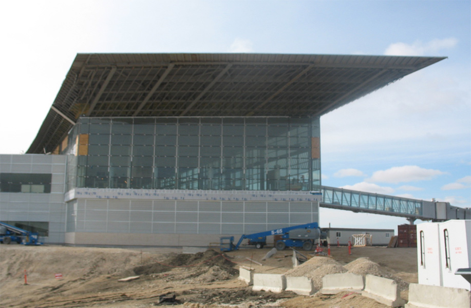 Pictured is the composite aluminum cladding used to achieve the crisp aeronautical lines of the terminal building installed by Flynn Canada Ltd.