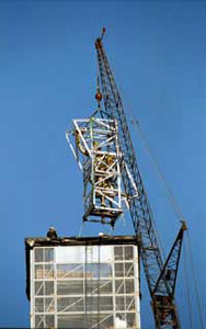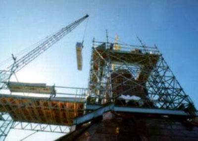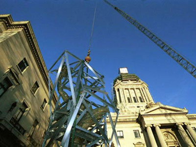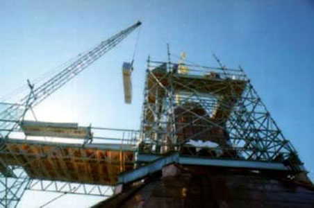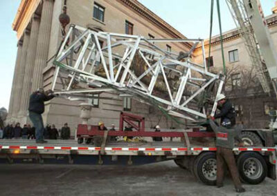 F. A. Roberts & Associates Ltd. was engaged to develop the procedures and design the apparatus to lift and transport the Golden Boy from Manitoba’s historic Legislative Building. Pictured here is the lifting and transport cradle that has been seen on television, the newspapers and even the cover of the Winnipeg telephone directory.