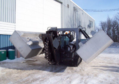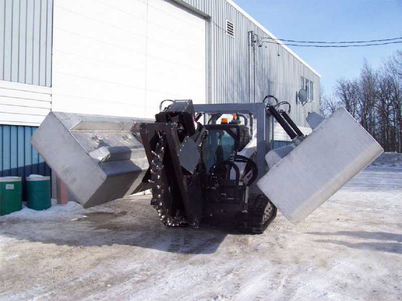 F.A. Roberts & Associates Ltd. was engaged to design a flotation system after one of the units broke through the ice and sank in 2009. Seen here is the hydraulically operated outrigger flotation system now used for these ice cutting units. Floats are raised for transportation. Flotation chambers are foam-filled aluminum structures.
