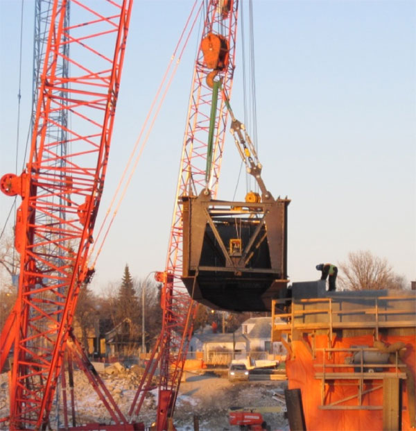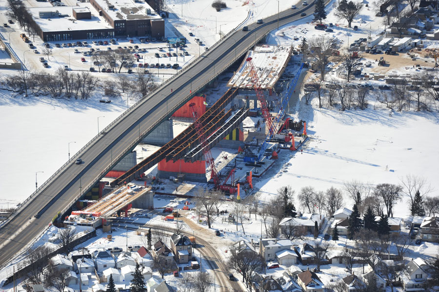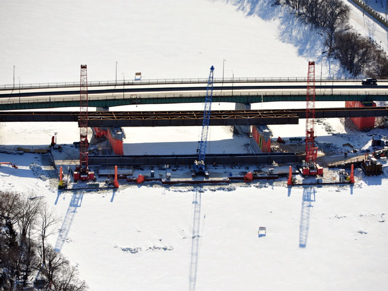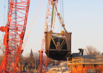 Pictured here is the lifting of an assembly of six girder segments forming one of the pairs of curved girders for the traffic span over the Red River. Challenges included assembly of the segments into the girder pairs on a barge straddling the river surrounded by the winter ice. The lift was accomplished using tandem crawler cranes on a pair of lifting barges. Custom lifting equipment was designed to allow lifting the curved sections while maintaining a horizontal position so that set down was simultaneous on all bearings.